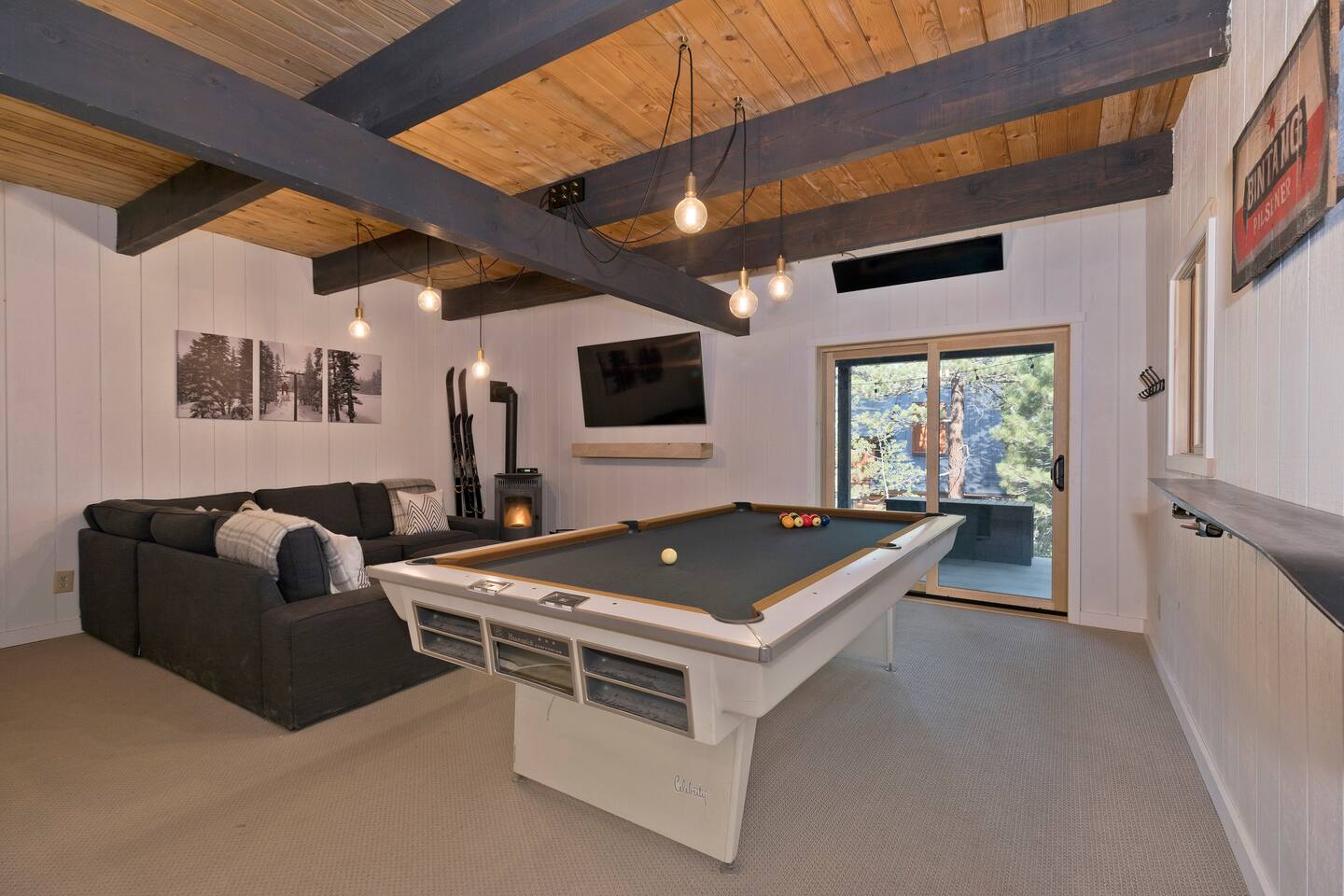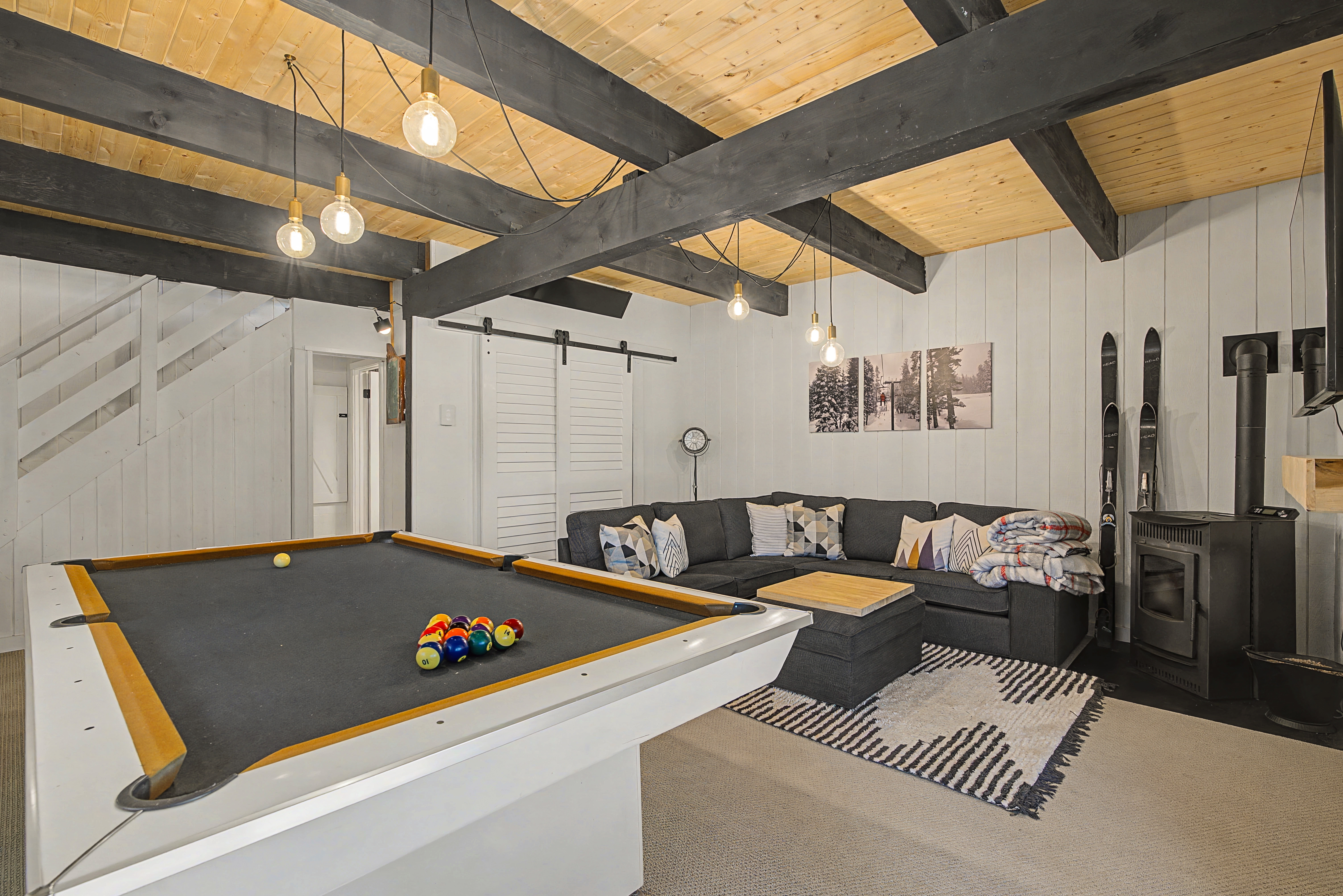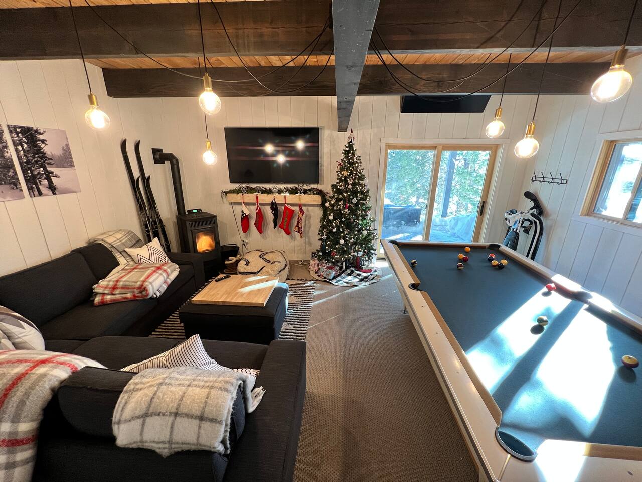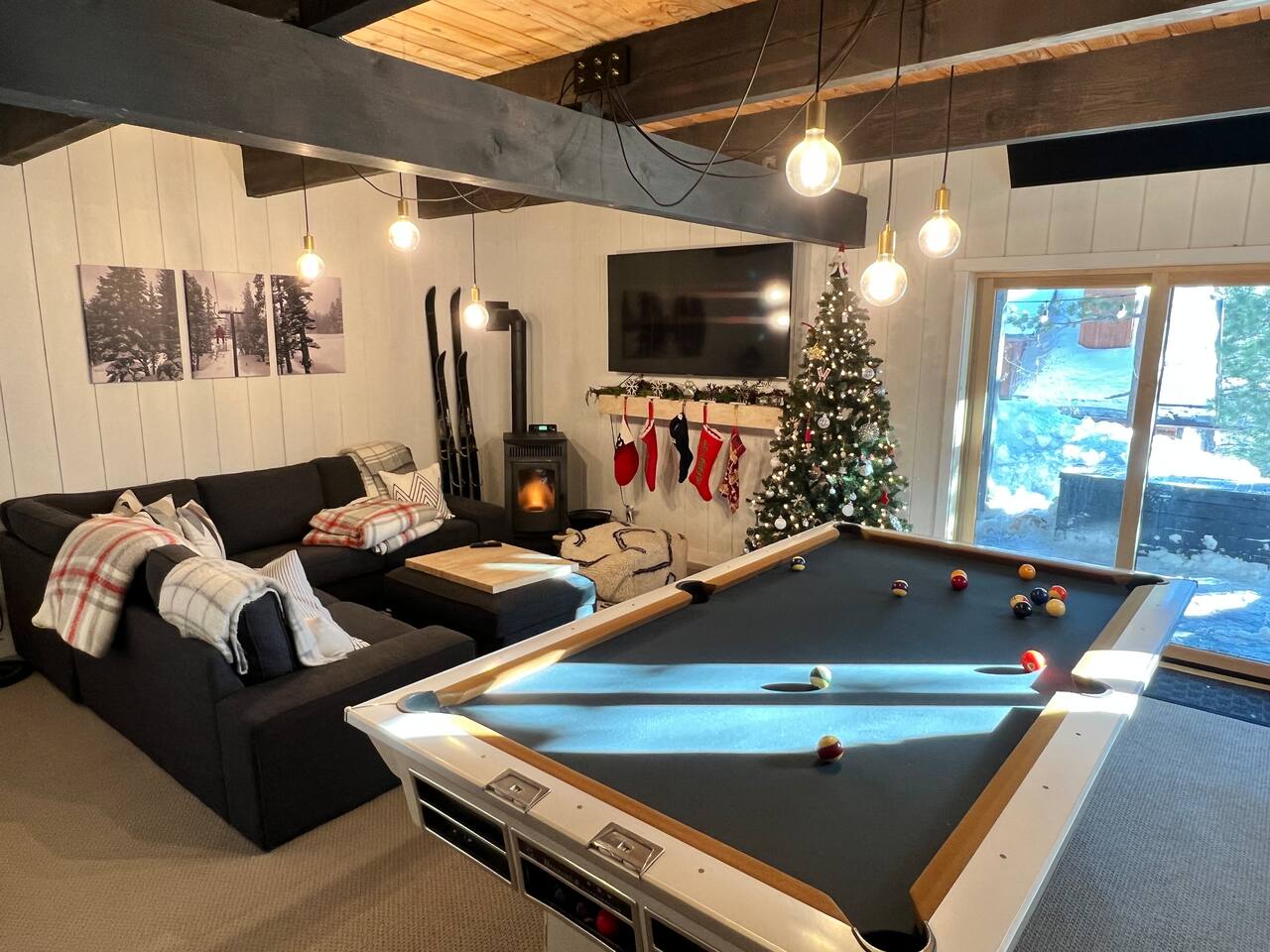 We have 3 huge bedrooms, two with memory foam king size beds on the main level, and a 3rd bedroom in the loft with two queen size beds. The main level opens up to a huge deck with views of the mountains, a Weber BBQ, and a firetable for relaxing around with a glass of wine. The loft area has a huge bedroom with two queen beds, and a separate lounge area with a couch and TV. In the walk-out basement, we have a vintage pool table, darts, large L-shaped sofa, 65" flatscreen TV, pellet stove fireplace, and full bathroom. There is a deck off the basement as well with a 7 person spa, perfect for soaking in after a day out exploring the area.
