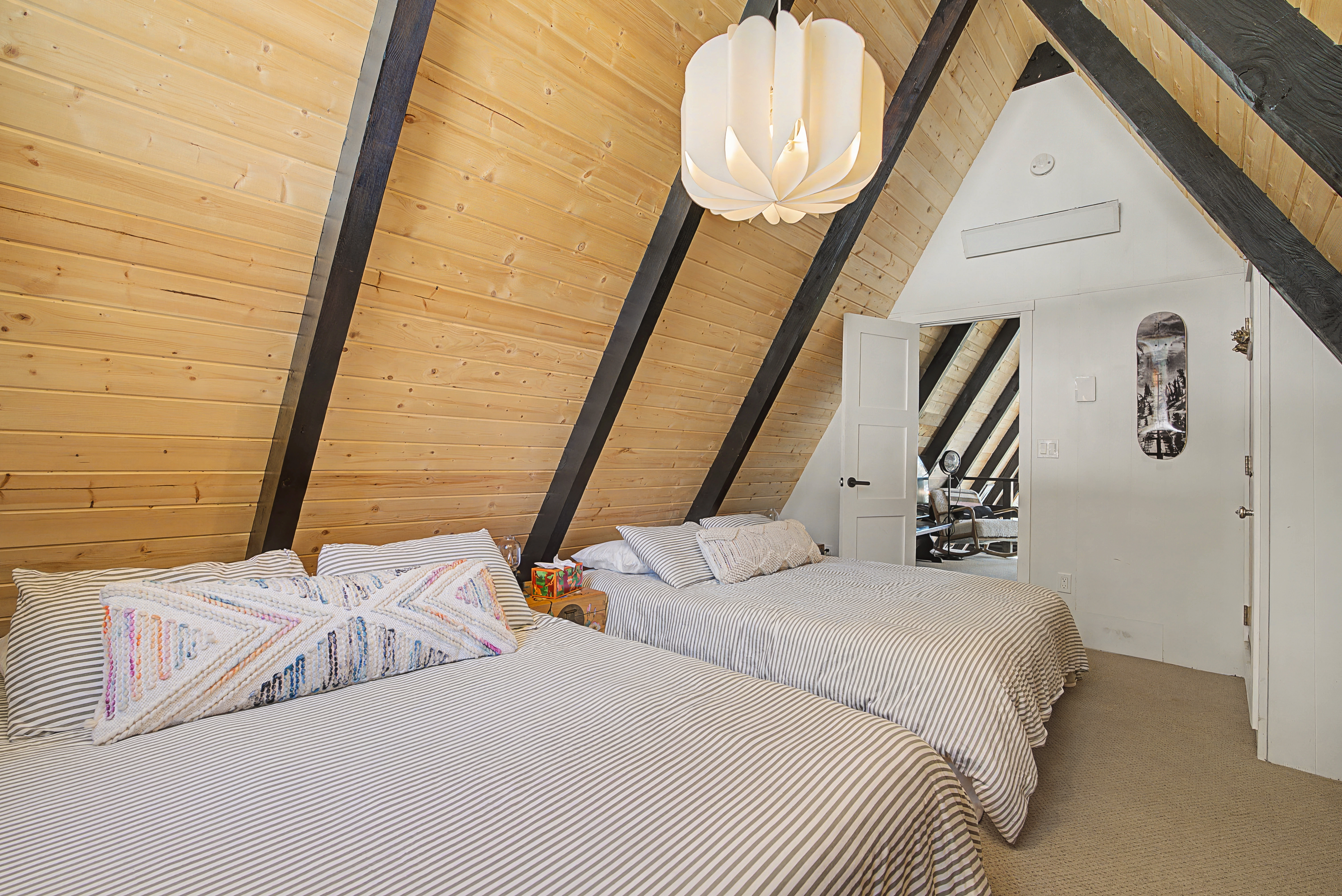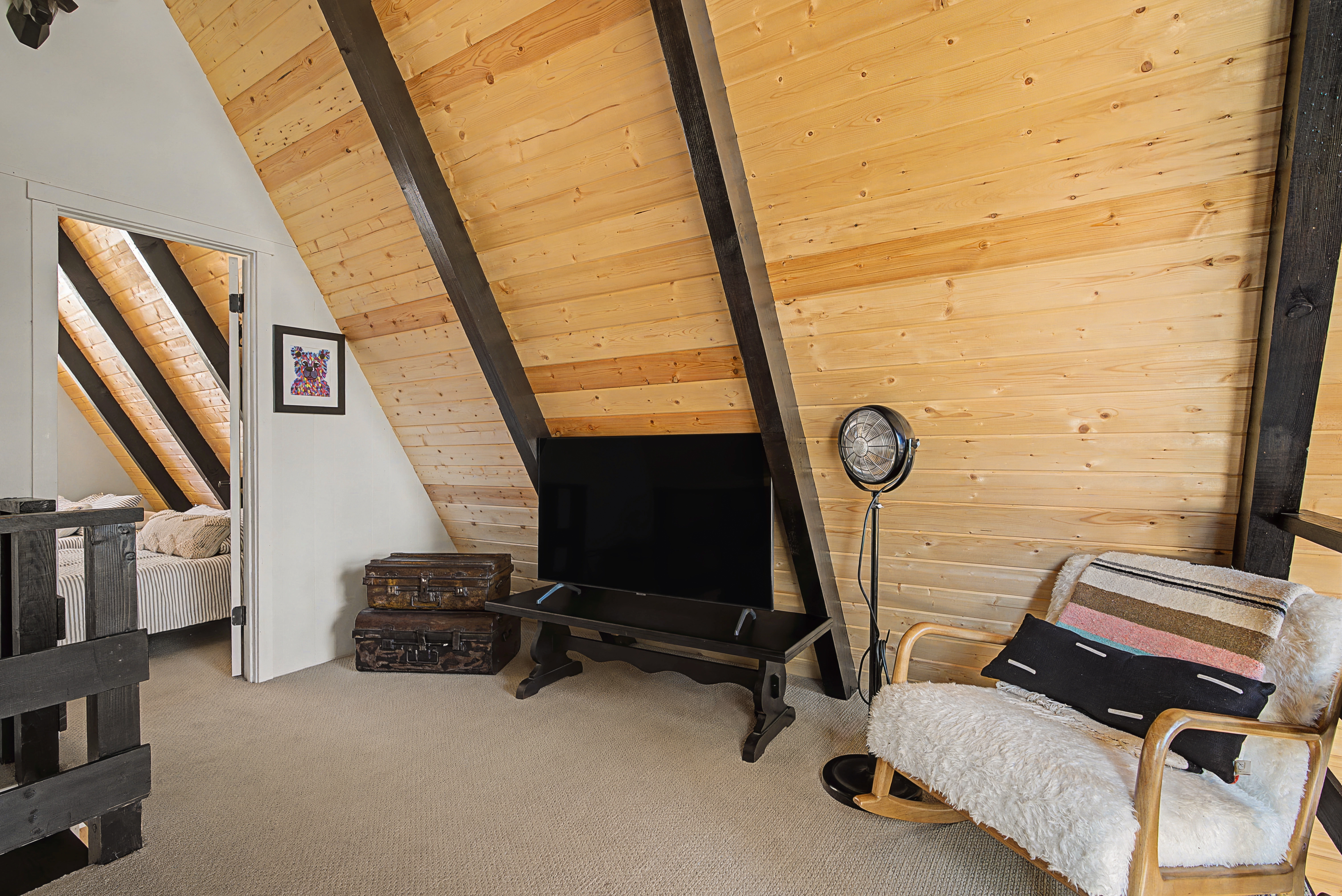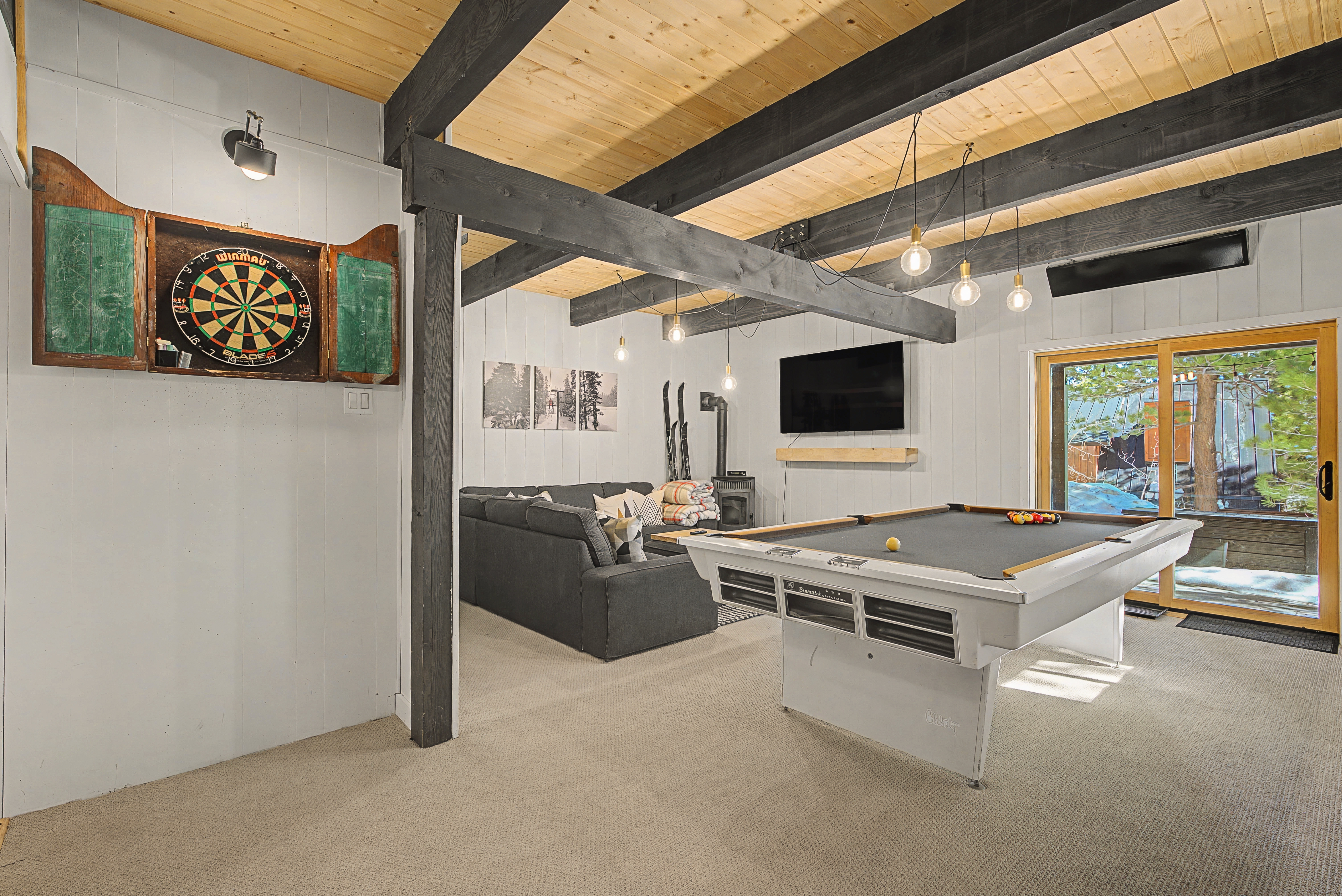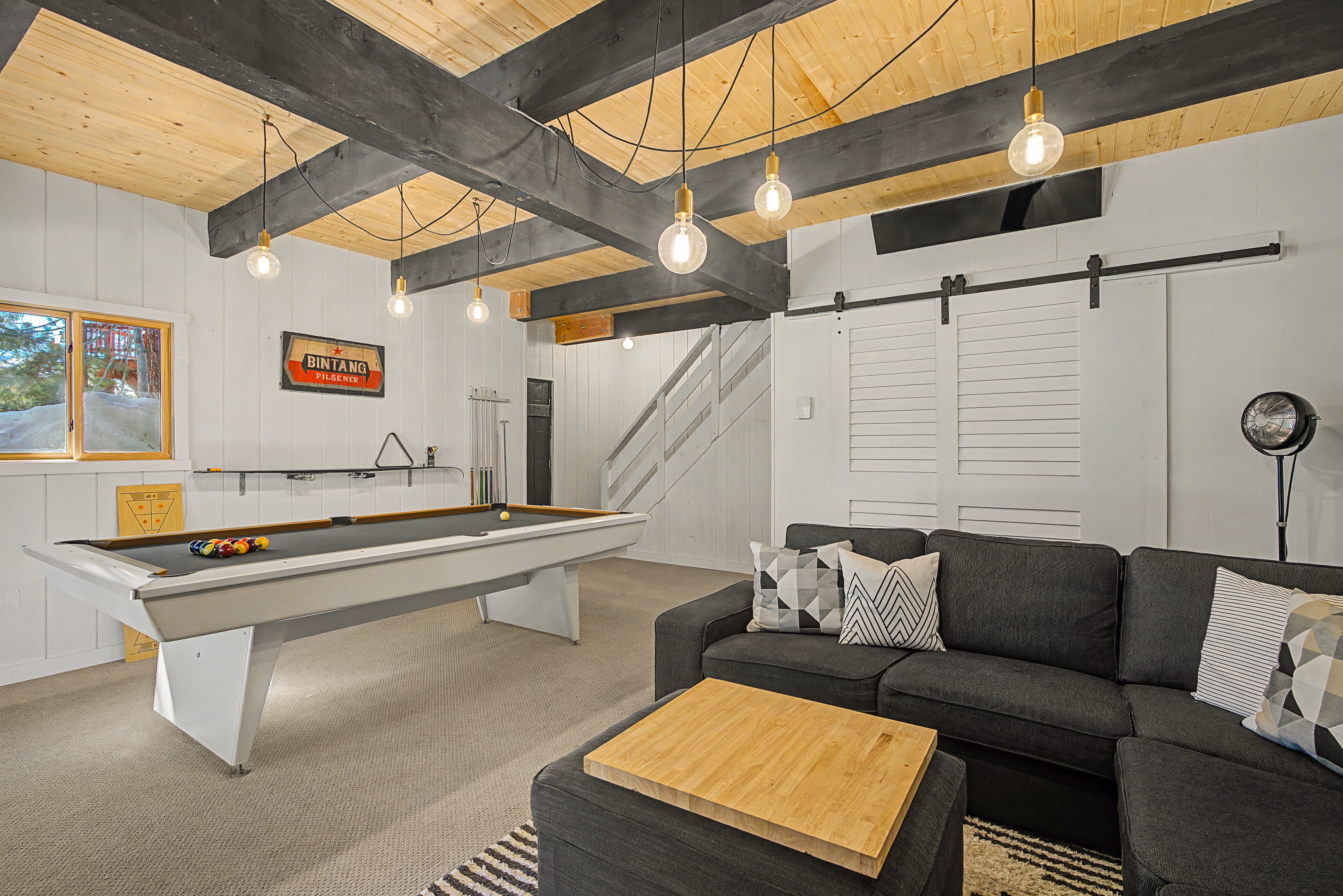 We have 3 huge bedrooms, two with memory foam king size beds on the main level, and a 3rd bedroom in the loft with two queen size beds. The main level opens up to a huge deck with views of the mountains, a Weber BBQ, and a firetable for relaxing around with a glass of wine. The loft area has a huge bedroom with two queen beds, and a separate lounge area with a couch and TV. In the walk-out basement, we have a vintage pool table, darts, large L-shaped sofa, 65" flatscreen TV, pellet stove fireplace, and full bathroom. There is a deck off the basement as well with a 7 person spa, perfect for soaking in after a day out exploring the area.